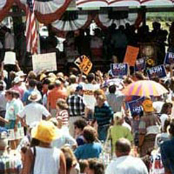 For 120 consecutive years, picnickers and politicians have been making their way to Fancy Farm for this annual event, held the first Saturday of August at St. Jerome's Parish in Mayfield. It grew out of a family reunion in the 1830s held at Fancy Farm, 10 miles west of Mayfield, the county seat of Graves County. For years the picnic was held down by the creek where the water was clean and clear and the trees gave abundant shade for a nice summer get-together. The men barbecued sheep and the ladies brought the trimmings. Games were played, and everyone had a great time. Gradually, the picnic evolved into an annual homecoming. After a hiatus during the Civil War years, the picnic resumed in 1880. Politicians began to attend the picnic early on, since, at that time, elections were held one week later.
