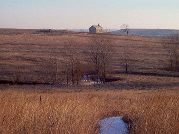 The trail winds across rolling hills, over a spring-fed stream lined with cottonwoodand hackberry trees, and through a fascinating array of grasses and flowers. Along the way is evidence of the insects, birds, and mammals that make the prairie their home. Take your time and notice the gray and white rock, the limestone and steel-tough chert, commonly called "flint," that was formed between 200 and 300 million years ago and gives the name to the resulting hills. Hike all the way to the little one-room school house on the hill and then back to the ranch headquarters. This photo was taken along the trail.